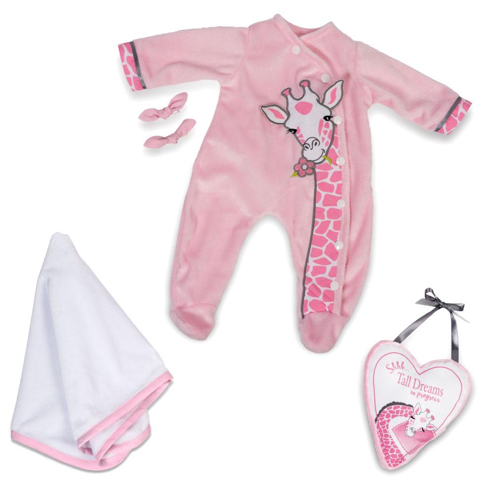- Comes with pink and white soft sleeper with giraffe applique, heart-shaped pillow and white velour blanket