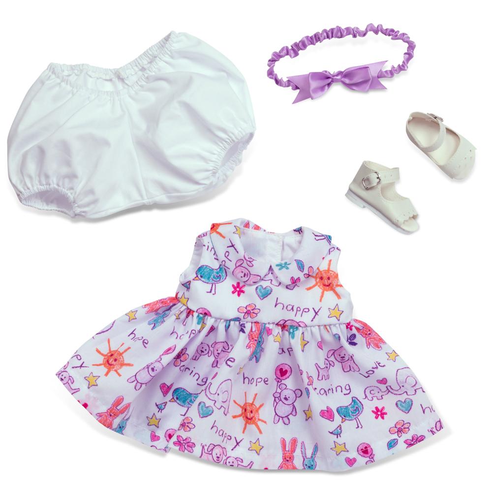 - Includes printed dress, white bloomers, purple headband, white sandals & purple plush puppy