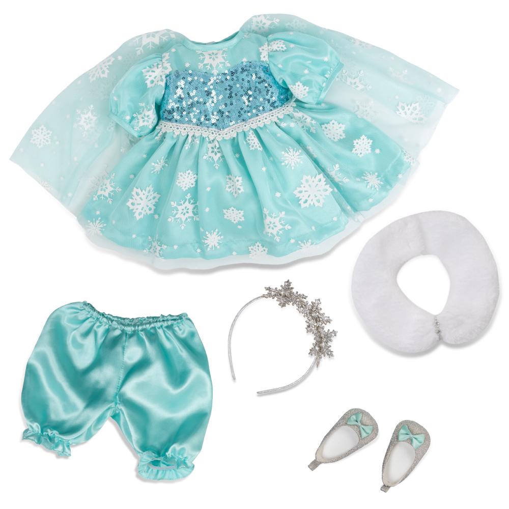 Her 20” inch frame is dressed in pure glacial glamour from head to toe with her regal aqua satin dress, complete with a screen-printed snowflakes tulle overlay. Her bodice is decorated with blue glistening sequins and elegant white trim. She wears a graceful matching tulle cape attached to her dress, satin bloomers, and a stylish faux-fur collar with a jewel detail that snaps around her neck. She has classic silver, sparkly shoes with blue satin bows, and her most favorite accessory is her fashionable “crown”, her shimmery silver headband with dazzling glitter snowflakes