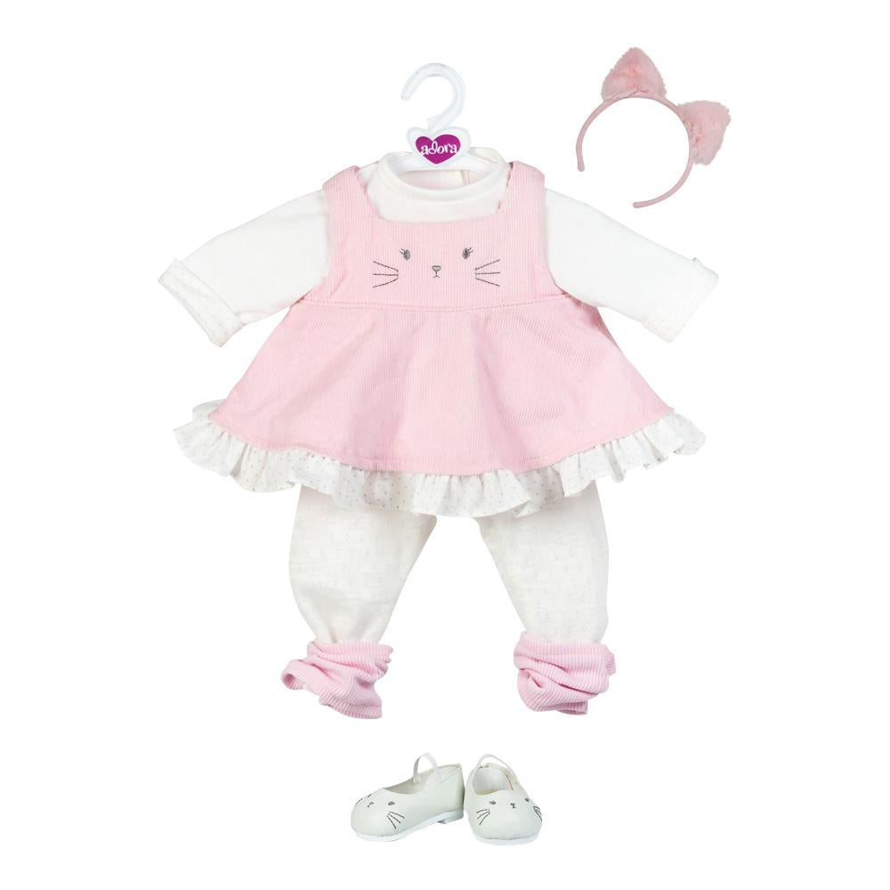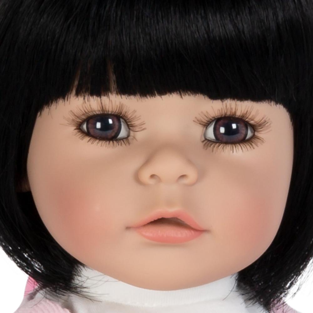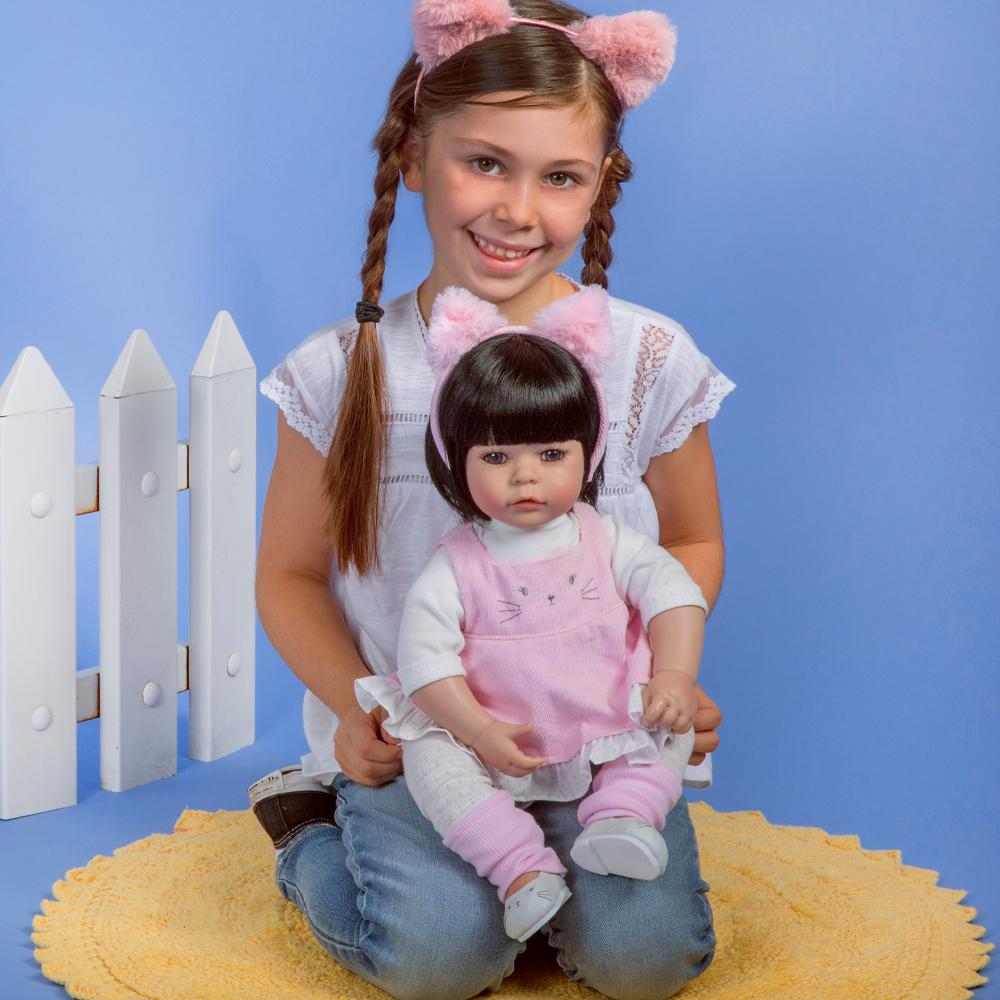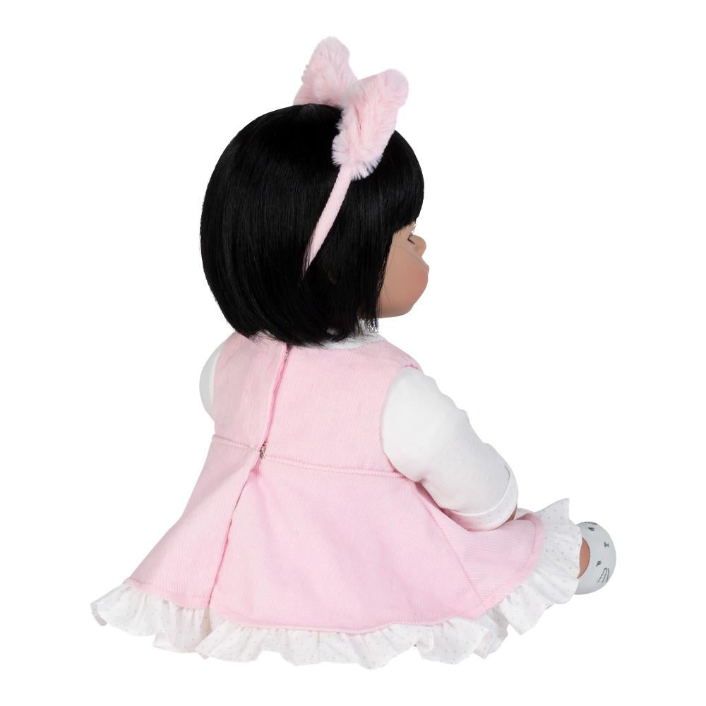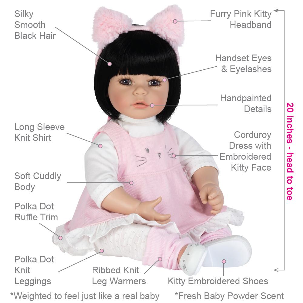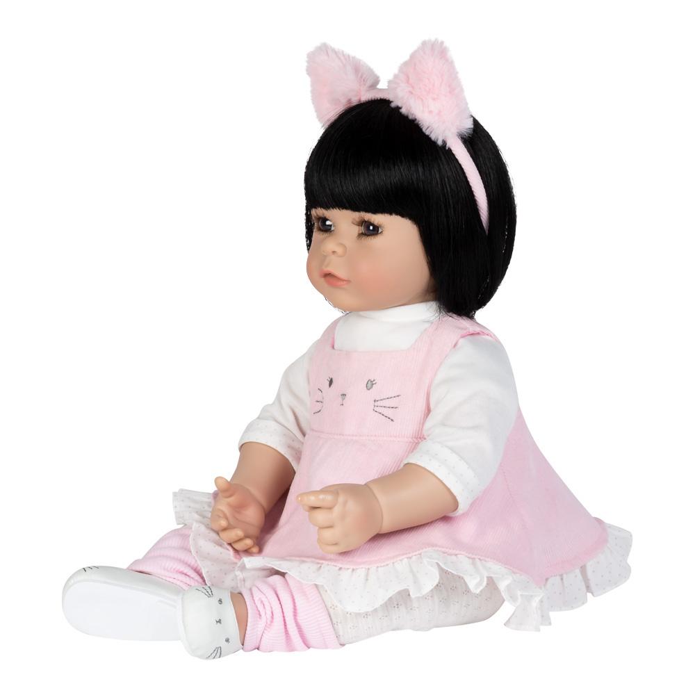 Meow! The perfect companion and friend, ToddlerTime Doll Kitty Kat is ready to play and take cat naps…with you! She comes dressed in a white long-sleeved t-shirt under a pink corduroy dress with an embroidered kitty face and white ruffle trim, white knit leggings and pink leg warmers. Her white kitty shoes and furry pink kitty headband are just too purr-fect to resist! Kitty Kat’s silk smooth black hair with bangs compliment her beautiful brown eyes and sweet rosy cheeks. Adora ToddlerTime Dolls are 20” from head to toe, made of baby powder scented high quality Cuddle Me™ vinyl with movable head, and ¾ vinyl arms and legs. NEW Cuddle Me™ Vinyl is soft, silky, gentle and feels more like a real baby, making these toddlers perfect for play! Each toddler doll has a weighted cloth body and comes complete with a traditional diaper for realistic play to develop social skills while engaging in nurturing, pretend play! Ages 6 and up.