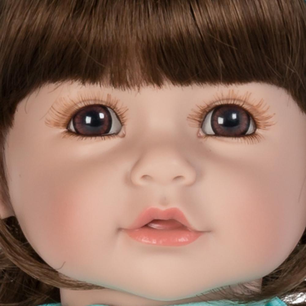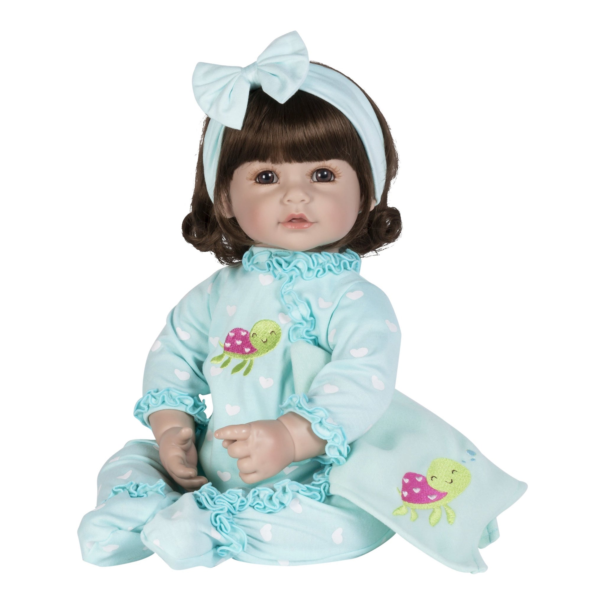 This little turtle is sleepy as can be and ready for naps, cuddles & lots of love! ToddlerTime Doll Sleepy Turtle comes ready for bed in her teal jersey knit PJs with signature white Adora hearts and a cute embroidered turtle on the front and ruffled details throughout! She can’t go anywhere without her teal fleece blankie with embroidered turtle and her matching jersey knit head wrap with bow completes her ADORAble outfit! Her silky smooth brown hair with bangs and bouncy curls compliments her beautiful brown eyes that can make anyone fall in love. Adora ToddlerTime Dolls are 20” from head to toe, made of baby powder scented high quality Cuddle Me™ vinyl with movable head, and ¾ vinyl arms and legs. NEW Cuddle Me™ Vinyl is soft, silky, gentle and feels more like a real baby, making these toddlers perfect for play! Each toddler doll has a weighted cloth body and comes complete with a traditional diaper for realistic play to develop social skills while engaging in nurturing, pretend play! Ages 6 and up.