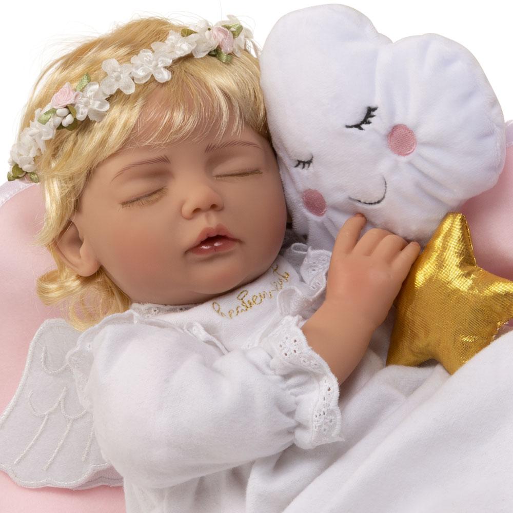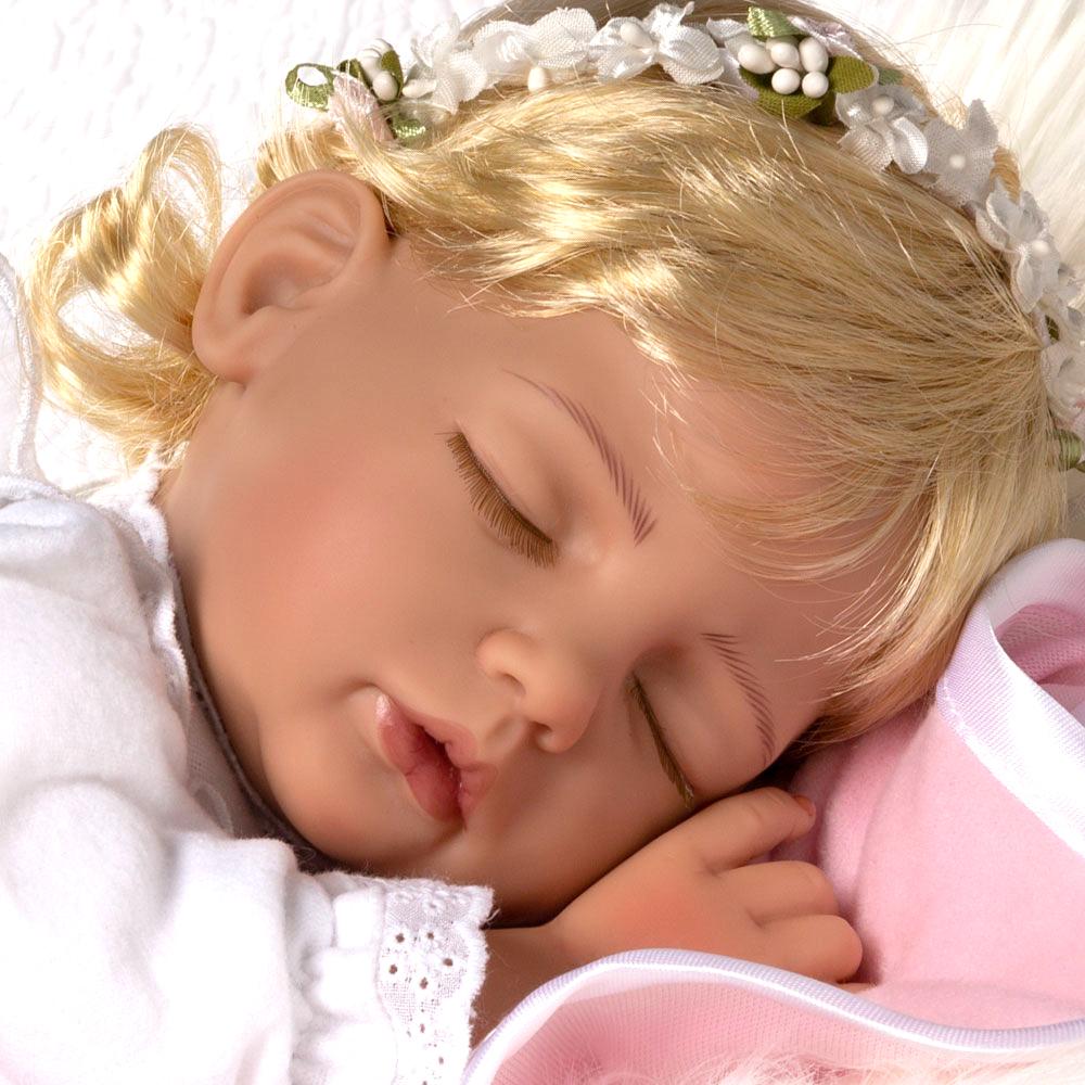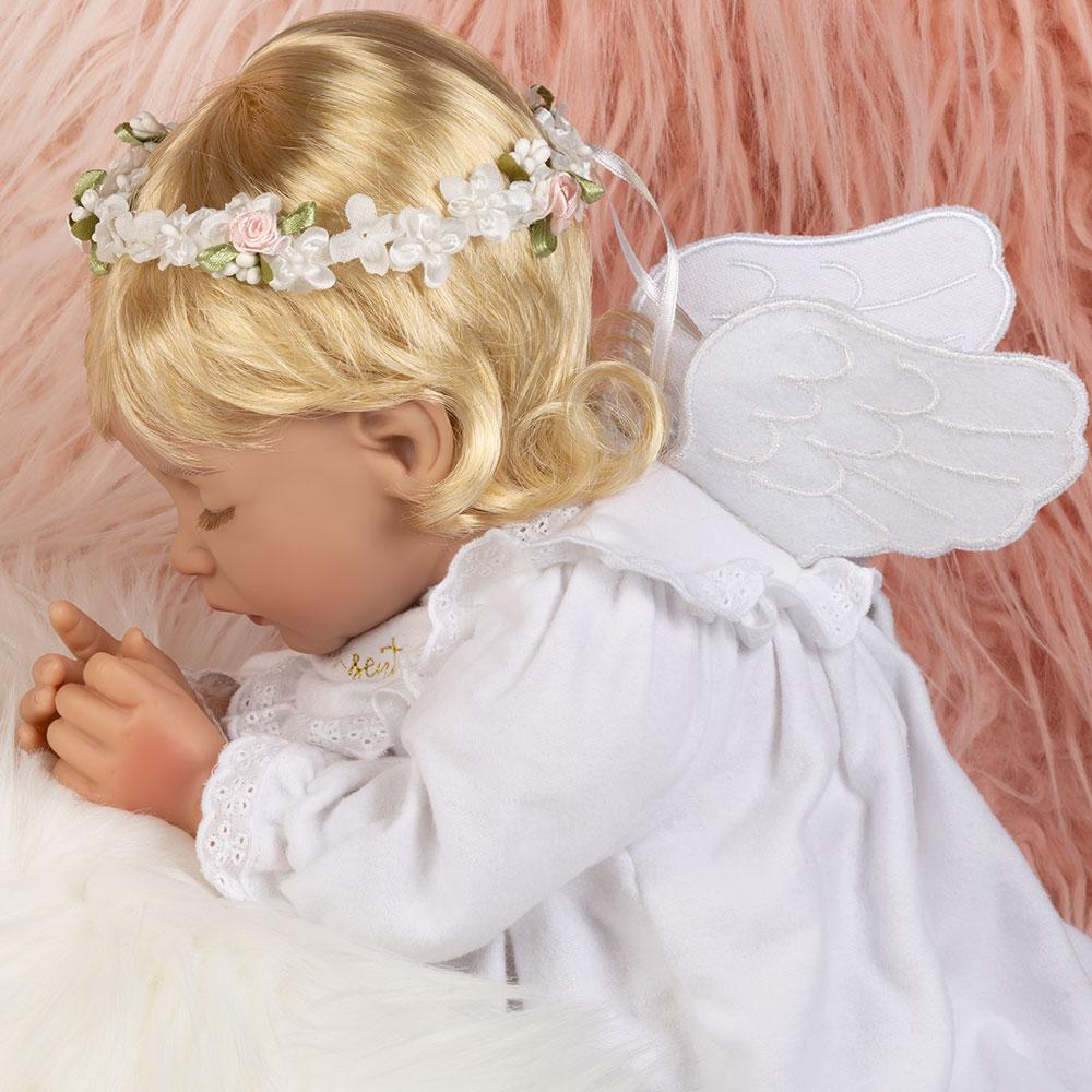 Thank heaven for little girls, including this sweet sleeping angel! She's surely Heaven Sent, napping in her cozy white flannel gown with gold embroidery, white felt wings, and a delicate hair wreath made of faux baby's breath and mini pink rosebuds. She's always ready to snuggle with her soft pink blankie and adorable puffy cloud pillow close by. Heaven Sent is sure to bless your life with love and joy. Together you'll be a match made in heaven.
