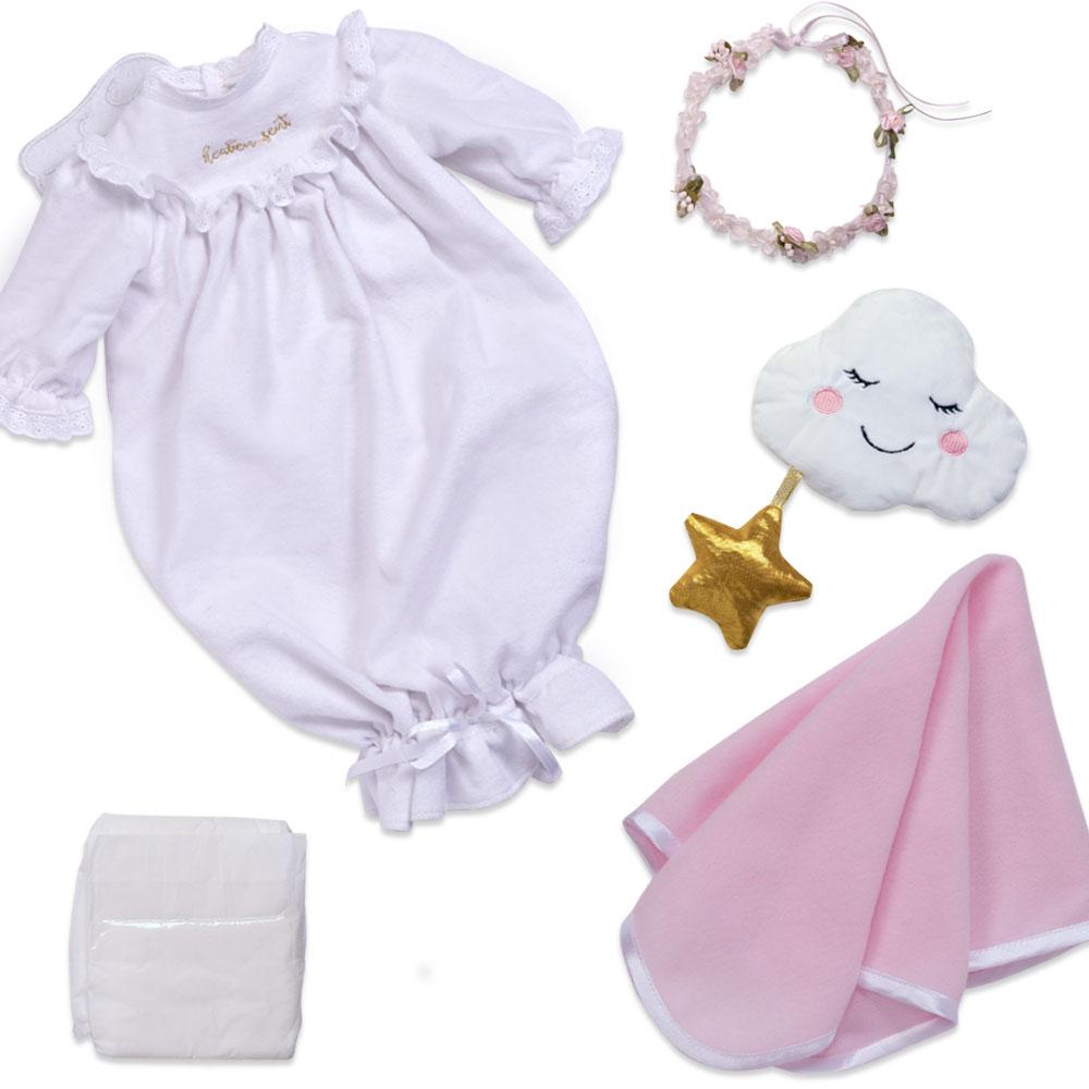 - Comes with a white flannel gown with eyelet trim, hair wreath, cloud & star pillow, and pink blankie