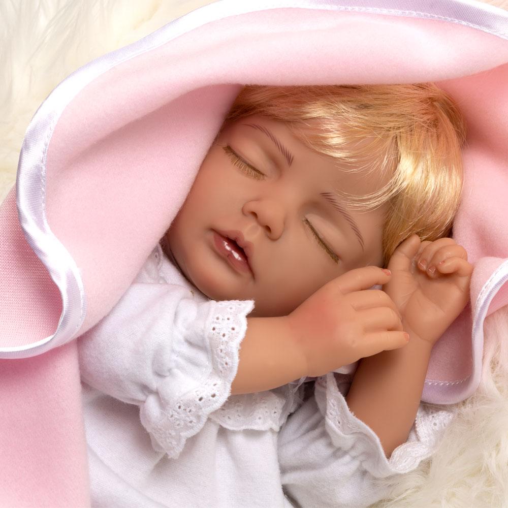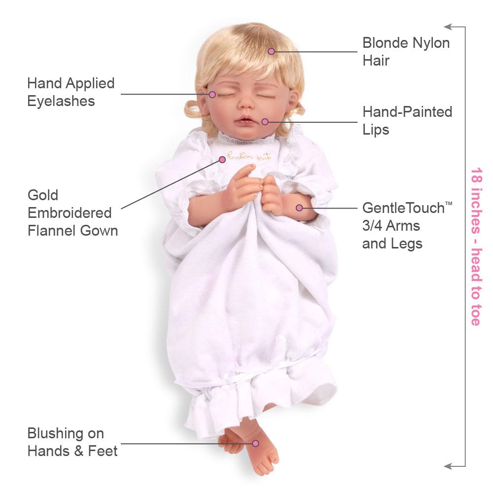 Heaven Sent is masterfully crafted by world-renowned artist Mayra Garza. She is created with GentleTouch™ vinyl and a weighted cloth body for that wonderfully lifelike feel. This realistic sleeping baby doll arrives inside a Collector’s Box and includes a numbered Certificate of Authenticity with the artist’s signature.