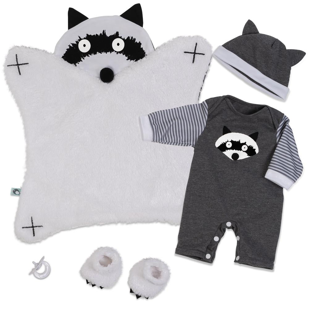 - Comes with a knit jersey raccoon-themed one-piece outfit with matching cap, Sherpa booties, a knit jersey and Sherpa blanket, and stem pacifier.