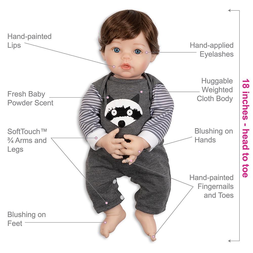 This 18” baby boy will melt hearts with his dreamy sapphire eyes, loving expression, and thick tousled dark brown hair that curls slightly at the ends. He has refined, delicate features with his cute button nose, squeezable rosy cheeks, and a playful smile revealing his fun-loving nature!