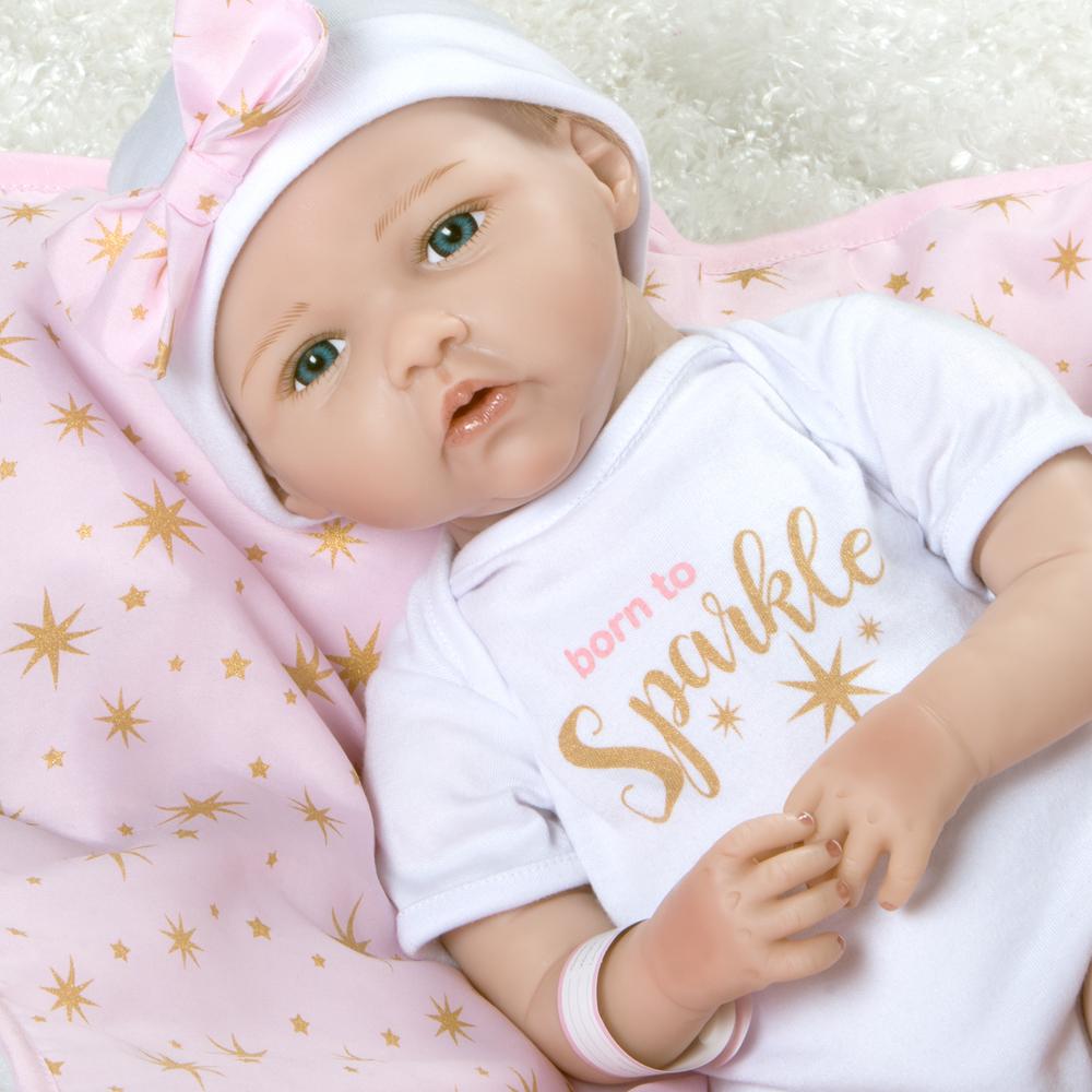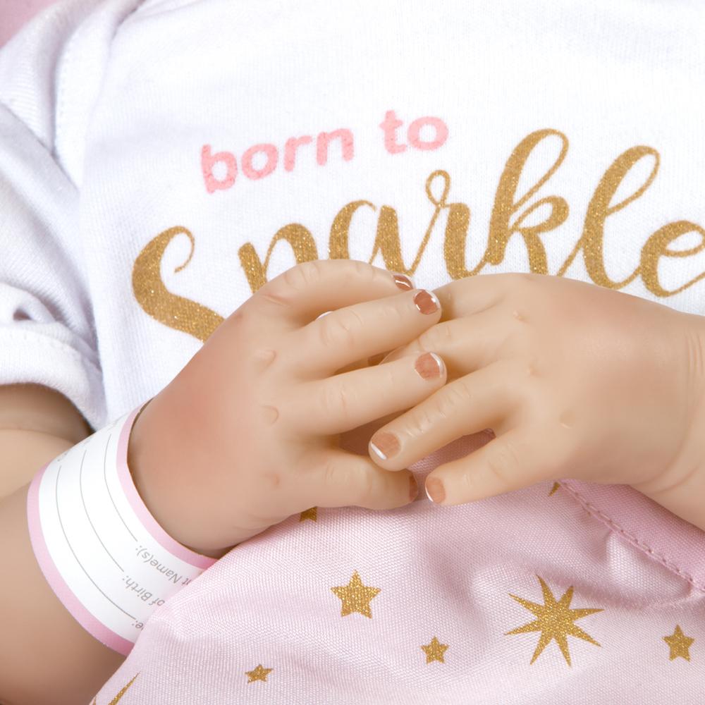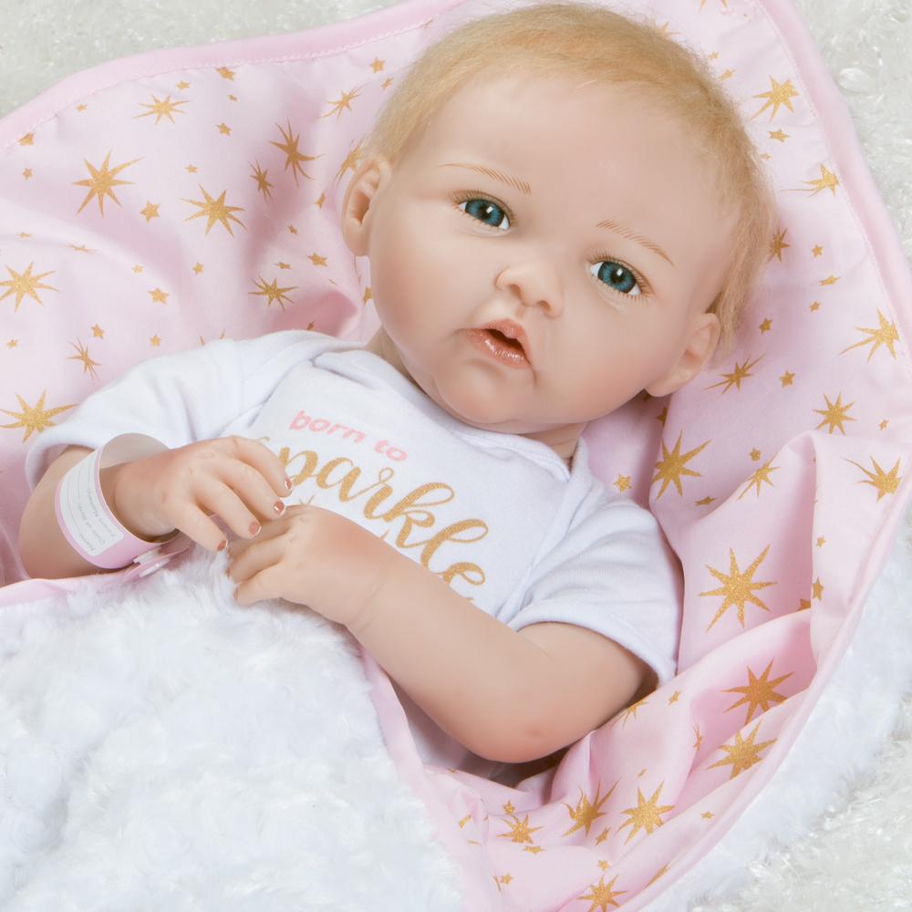 Born to Sparkle by Jannie de Lange is part of Paradise Galleries’ precious Baby Bundles collection, a group of 7 ultra-realistic baby dolls that look like true newborn baby dolls. Each Baby Bundle is handcrafted in unbelievably lifelike silicone-like FlexTouch vinyl, featuring faux mohair and hand-painted details. This FlexTouch vinyl technology makes her feel just like a silicone baby doll. Every newborn bundle is outfitted in a white cotton onesie with themed saying printed on the chest, and a cute cap. These new arrivals also come with a cozy, cushiony soft receiving blanket tied up with a bow, gift tag, a customizable hospital bracelet, birth certificate, and diaper. All Baby Bundles also come in a Collector’s Box and a signed Certificate of Authenticity with the artist’s signature.