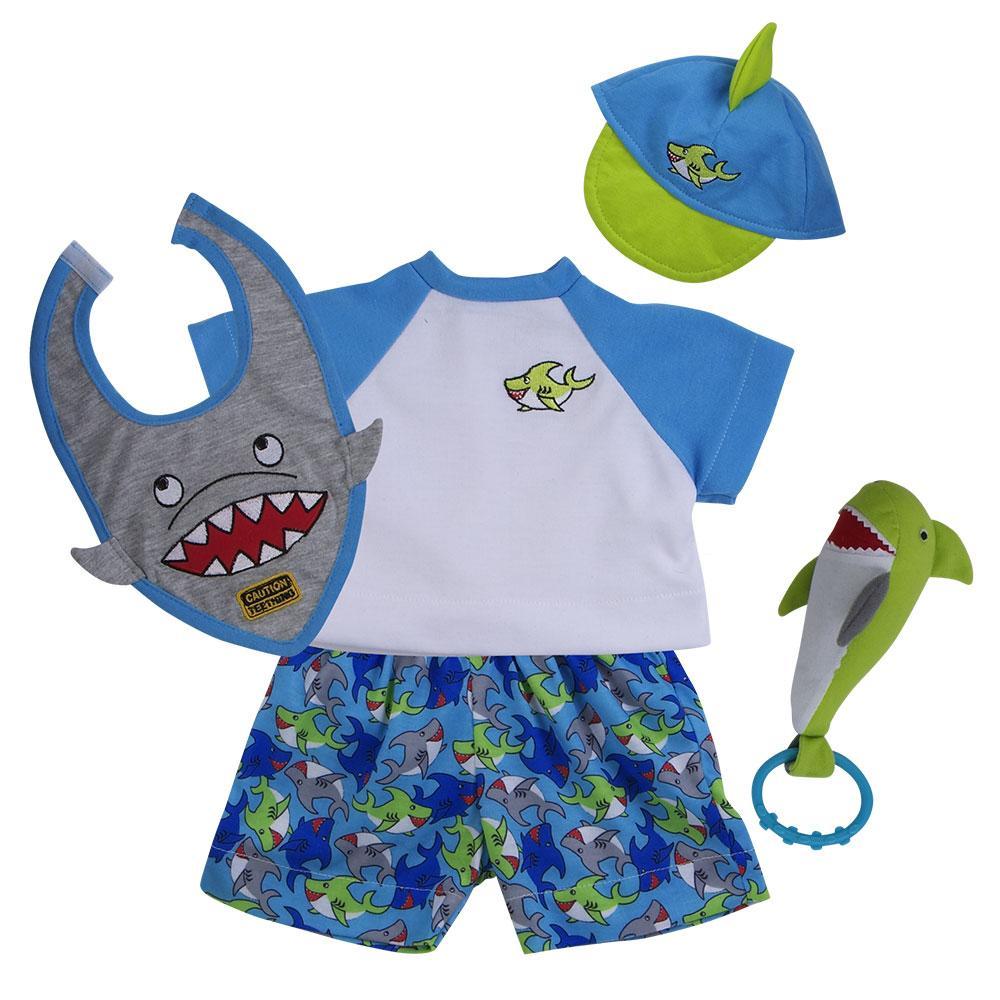 Sharkey is ready to take a bite out of life! His playful bib reads “Caution Teething” and he comes with a plush shark teething ring. He also has his beach blanket, baseball cap with shark fin, and his exclusive shark print board shorts so that he’s ready for a day at the beach!