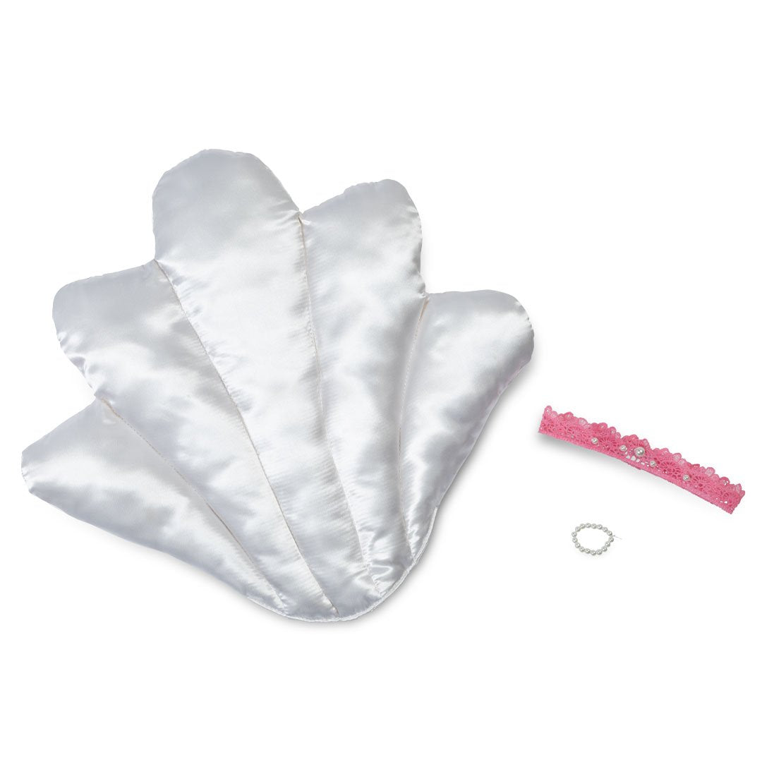 - Comes in an iridescent pink posable mermaid tail with tulle detail, a pearl bracelet, headband crown, and white silk shell pillow