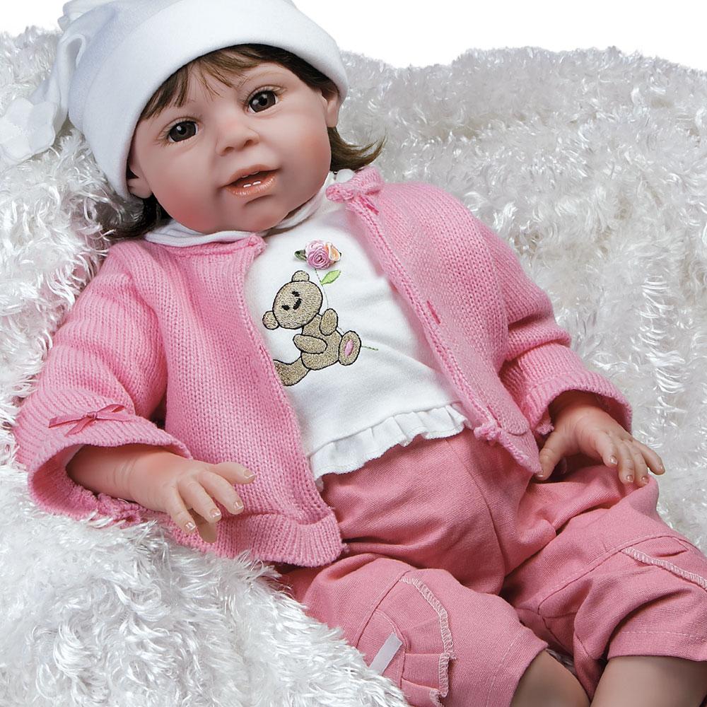 Cuddly as a sweet baby “Beary Cute” will lay sweetly in your arms dressed in her jersey top with ruffle flounce and embroidered with a cute teddy bear and detail applied flower rosettes. To keep her arms warm, she is wearing a peachy pink knit button-up sweater. Her pants are woven sheeting with pieced insets at the knees and accented with a delicate ruffle white satin ribbon.