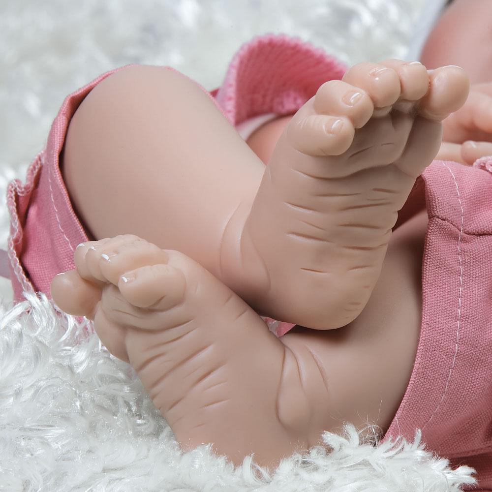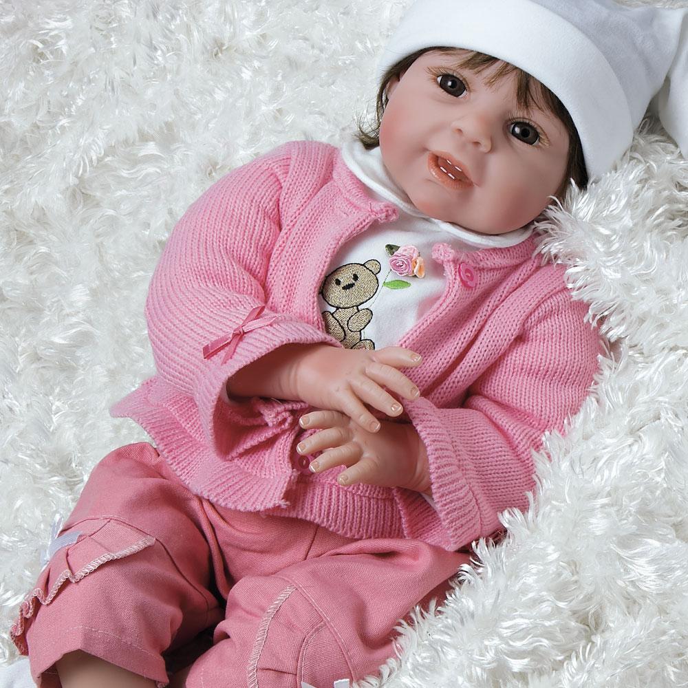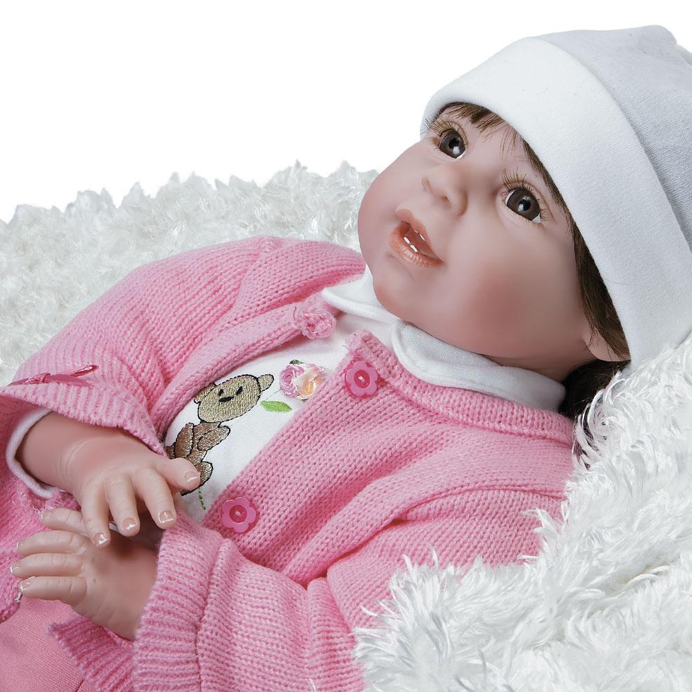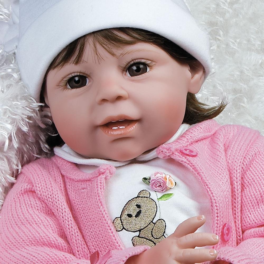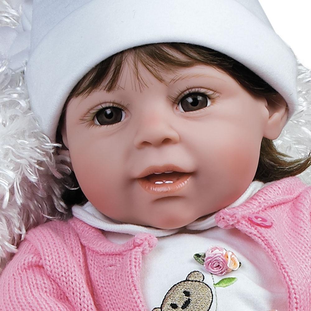 Beary Cute’s adorable face, round eyes, and chubby cheeks make for the most beautiful baby doll expression. Her head is kept warm with a white stretch hat detailed at the end with a cute flower accent. Sweet baby fingers and toes make her the most adorable baby you’ve seen. Once you pick her up you'll want to cuddle her forever!