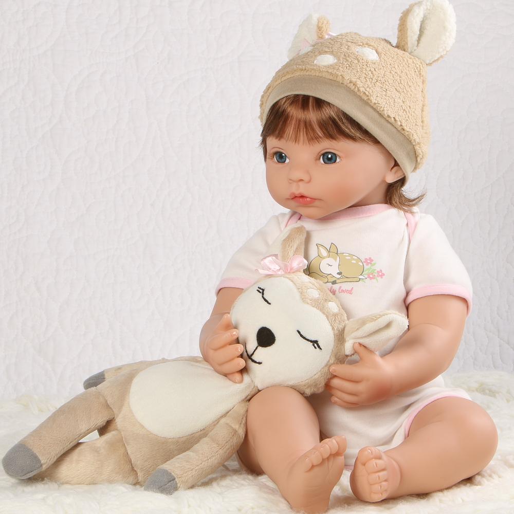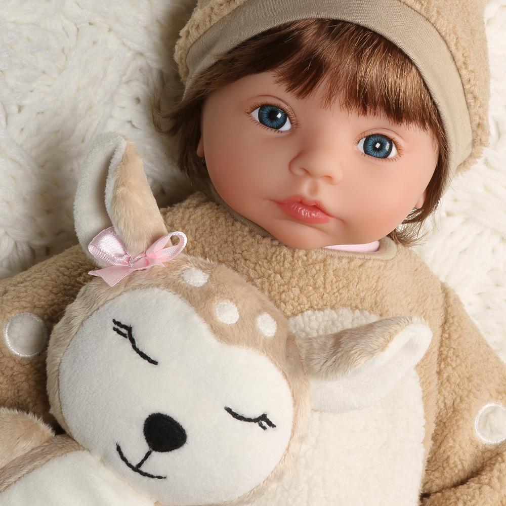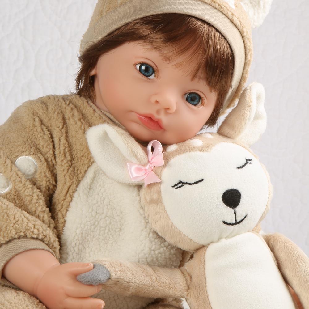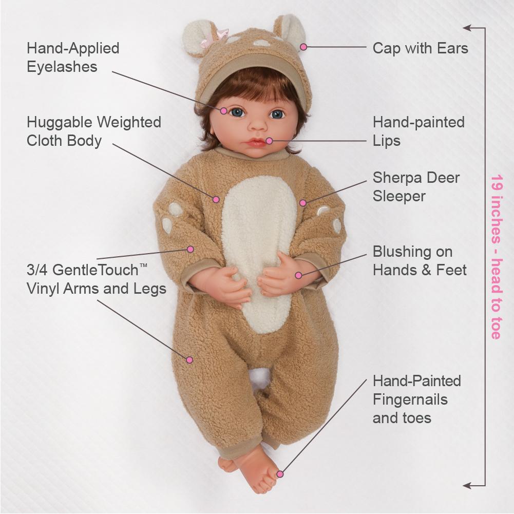Dearly Loved has two complete outfits, so she’ll be dressed up for every occasion. She has a cozy fawn sleeper with a cap and booties, which will keep her warm and cuddly. Underneath, she has her “Dearly Loved” onesie which can be worn in warmer weather. She is 19 inches from her head to her toes and is the perfect size for cuddling. She also has a huggable weighted cloth body, making her feel even more realistic. This little toddler will enjoy going on your camping trips and spending time among the pine trees and her little forest friends.
