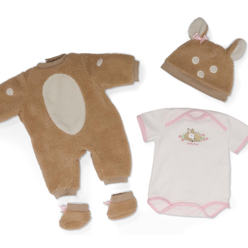- Includes cozy fawn sleeper, cap, booties, “Dearly Loved” onesie, and matching deer plush