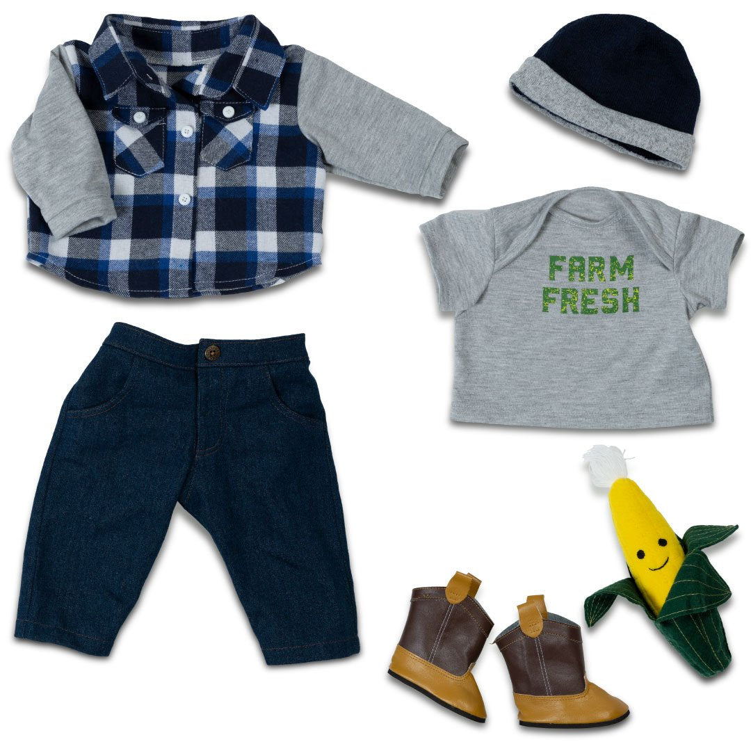 - Comes with a heather gray t-shirt with his namesake printed on, flannel over shirt, jeans, faux-leather boots, knit cap & corn on the cob plush