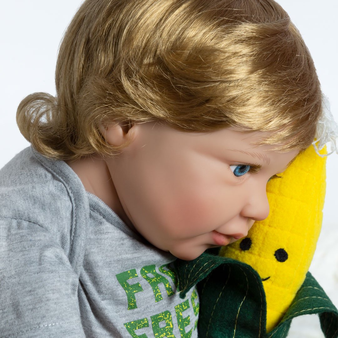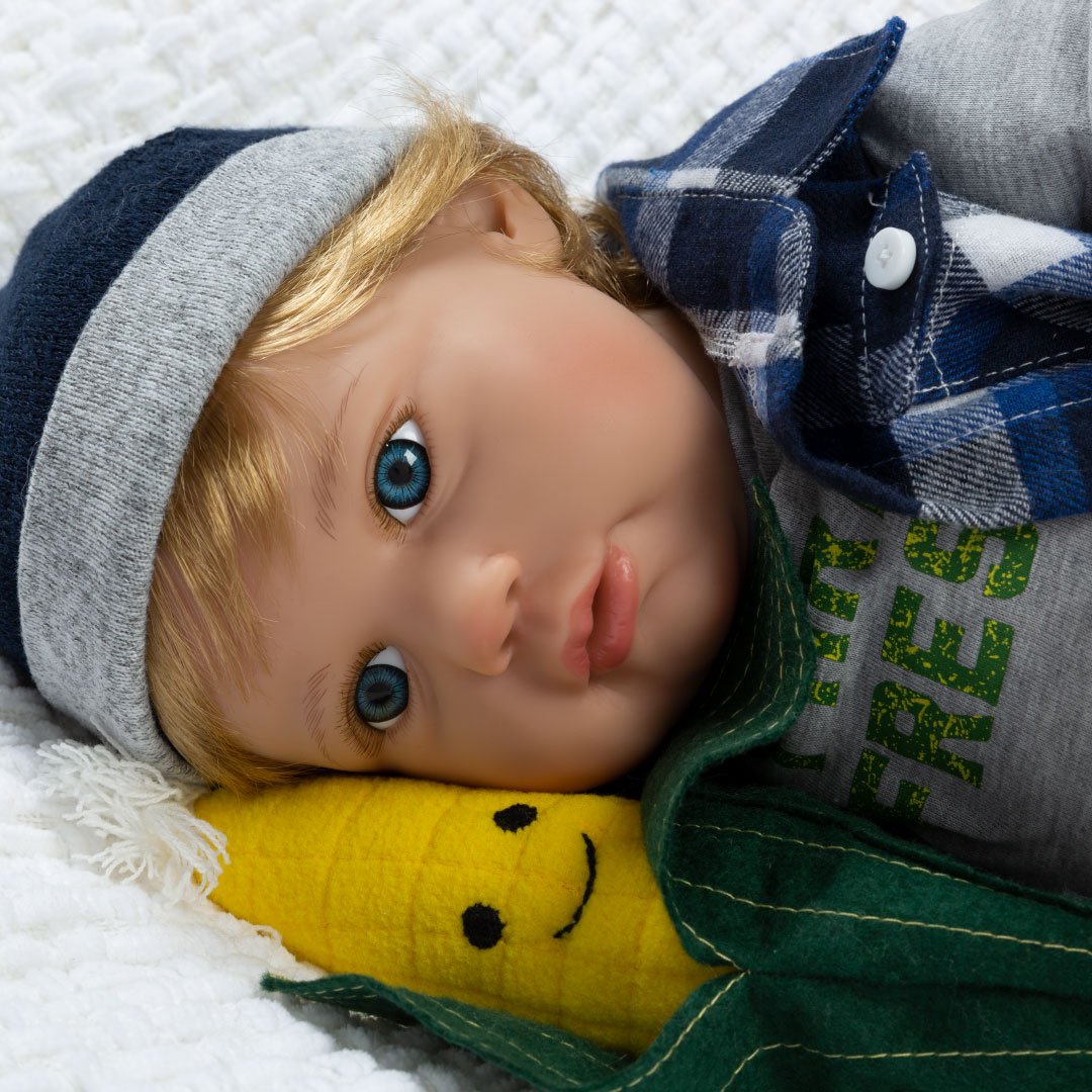 Farm Fresh Boy is skillfully sculpted by world-renowned artist Jannie de Lange. Individually molded using our exclusive SoftTouch™ Vinyl, his weighted cloth body provides a wonderfully lifelike feel. This adorable reborn-like toddler doll arrives inside a Collector’s Box and includes a numbered Certificate of Authenticity with the artist’s signature.