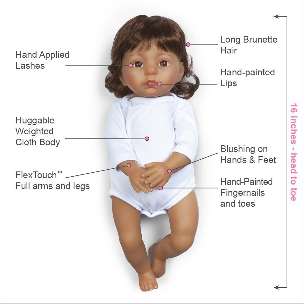Cable Knit Cutie is masterfully sculpted by Italian artist Fiorenza Biancheri. She is handcrafted in FlexTouch™ Vinyl and feels wonderfully lifelike with a weighted cloth body. This realistic toddler doll arrives inside a Collector’s Box and includes a numbered Certificate of Authenticity with the artist’s signature.