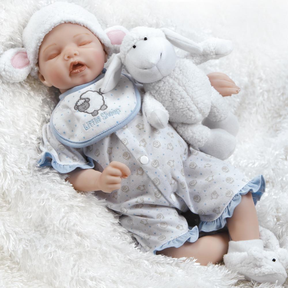 What a sight in newborn innocence is this Sweet Dreams Mary Ensemble! This sleeping baby doll is so peaceful in her lamb printed onesie with blue ruffled trim. You won’t need to count sheep with this sweetheart ensemble, you’ll want to spend every waking moment with her!