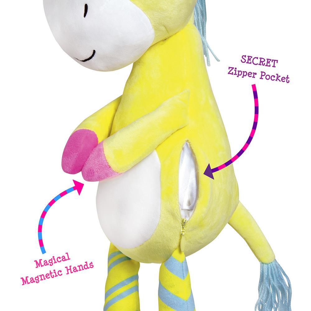 Come out and play! "Giselle" is part of Adora's Zippity Hug "N" Hide™ collection of whimsical Adora stuffed animal plush friends. This soft baby toy is 21.5 inches tall and so ADORAble with her fanciful giraffe features safe for kids 3 and up. Giselle has a lemon yellow ultra-soft microfiber plush body with a sweet white belly that your little one will surely love to cuddle and hold! Her big lavender eyes are embroidered and complement her lavender ossicones. Her hands are magnetic so she can hold her own hands together or the hands of her Zippity friends! And if you look closely you will see her secret pocket with a hidden zipper on the side of her belly.