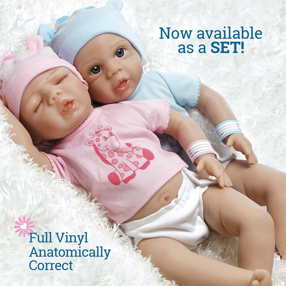 Tiny Twin Boy & Tiny Twin Girl are Paradise Galleries' only dolls that are 100% vinyl from head to toe, AND they are anatomically correct! They are made with our exclusive GentleTouch vinyl with lifelike and amazing realistic details! Both are masterfully sculpted by renowned artist Pat Moulton with lifelike detail such as little newborn wrinkles under their eyes, belly buttons and pouty lips that are slightly open. Both are dressed in a cute t-shirt with giraffe design, giraffe beanie, cozy ankle socks and knit diaper with velcro closures. You can even give them names by customizing their included hospital bracelets!